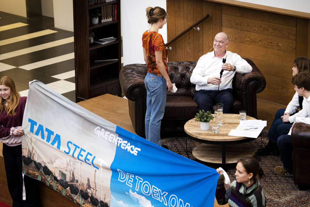 Activisten van Greenpeace voerden actie tijdens een interview van studenten van de Universiteit van Amsterdam (UvA) maandag met topman Hans van den Berg van Tata Steel. Twee demonstranten die aan de UvA studeren liepen even na het begin van het interview naar voren met een spandoek met de tekst "Tata steelt de toekomst" en hielden dat tijdens de rest van het interview omhoog.