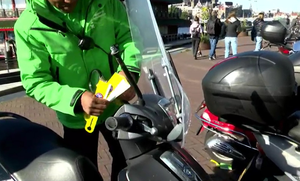 "Kijk, dit is een grensgeval", zegt fietscoach Mario in Goedemorgen Nederland op NPO 1 over een scooter die net buiten het scootervak staat geparkeerd. "Hier moet nog een container langs kunnen, dat gaat nu bijna niet." En dus krijgt de scooter een waarschuwingslabel. Dat is geen boete, maar een papiertje waarop valt te lezen dat de scooterbezitter in het vervolg zijn voertuig beter moet parkeren.