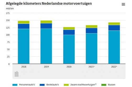 Nederlanders gaan vaker met hun motorvoertuig de weg op, maar het aantal gereden kilometers - exclusief die van motor- en bromfietsen - ligt nog altijd lager dan in 2019, voordat de coronapandemie uitbrak. Toen werd in totaal 150,1 miljard kilometer afgelegd. Daarentegen waren in 2022 meer motorvoertuigen (2,9 procent) in gebruik dan in 2019.