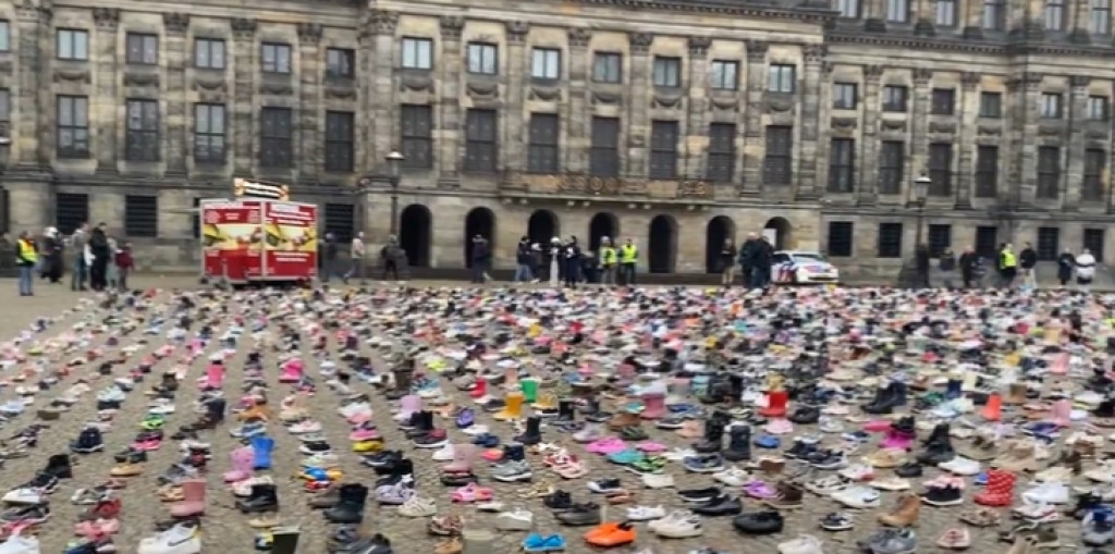 Op de Dam in Amsterdam zijn 10.000 kinderschoenen neergezet en zijn de namen en leeftijden voorgelezen van de kindslachtoffers die gevallen zijn tijdens de oorlog in de Gazastrook.