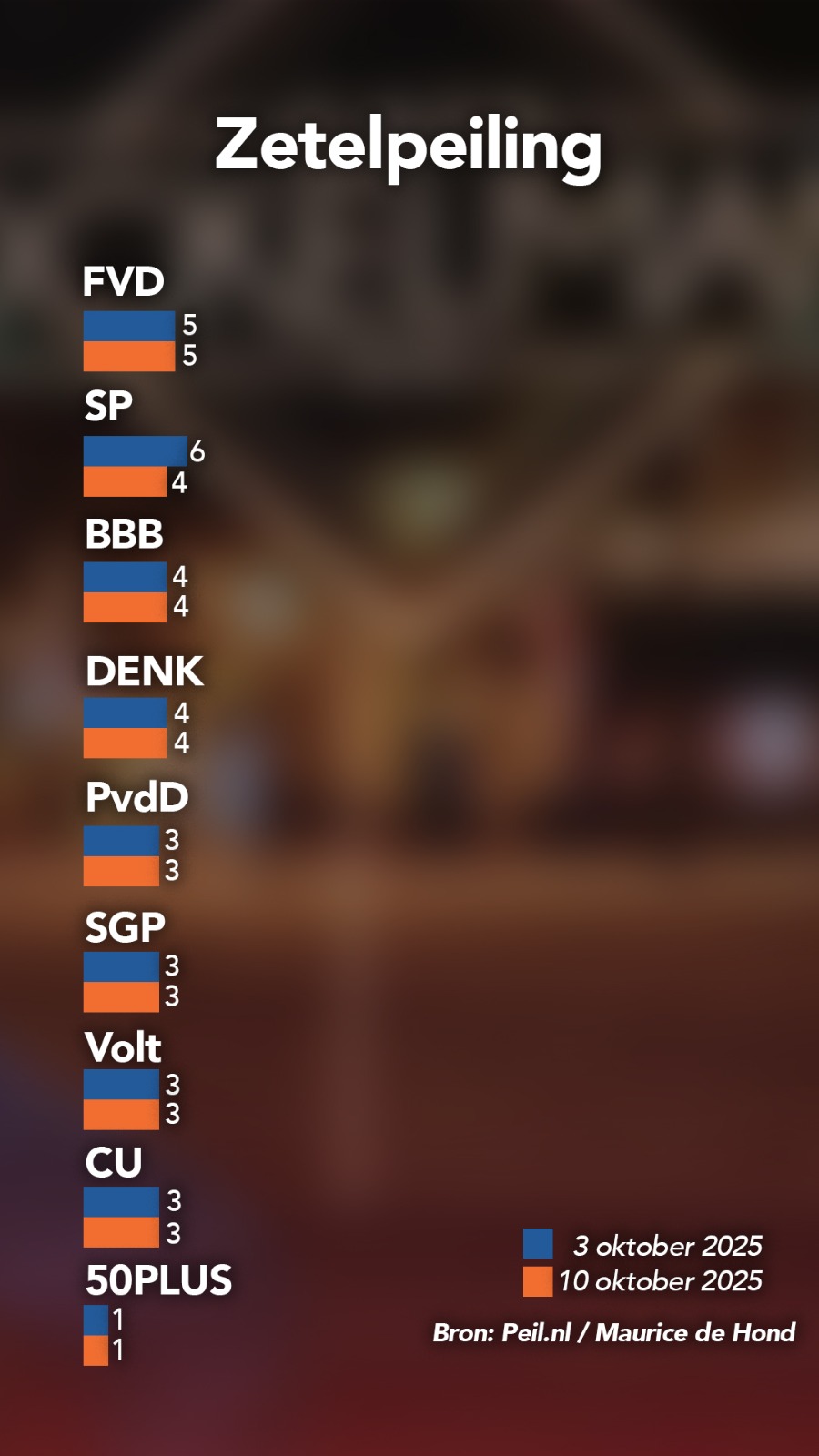 Opvallend is dat de SP ten opzichte van de peiling van 3 oktober maar liefst twee zetels inlevert. De partij van Jimmy Dijk gaat van zes naar vier. De Hond benadrukt dat veel kiezers nog geen definitieve keuze hebben gemaakt.