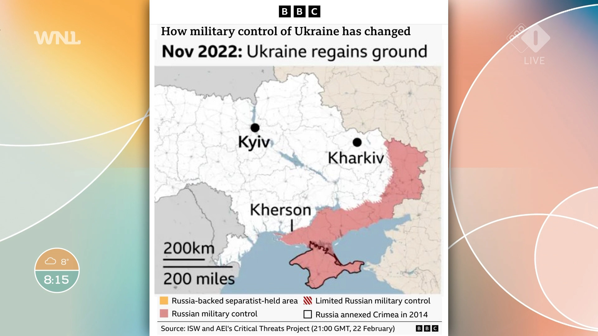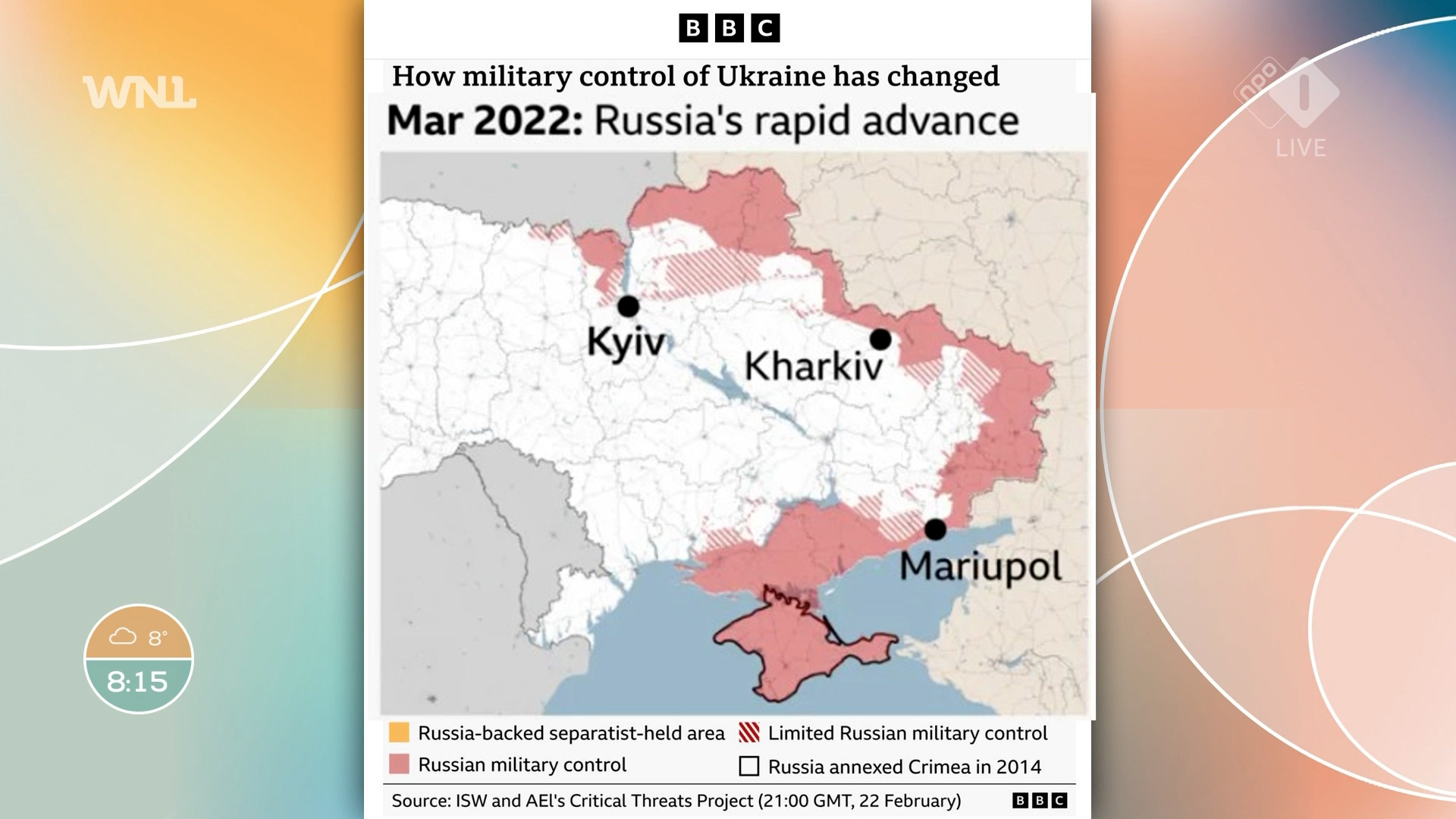 Acht jaar later, in maart 2022 en een maand na de start van de Russische invasie, had Rusland een vrij groot gebied veroverd, in het zuidoosten van Oekraïne, evenals het noorden en de regio boven Kyiv.