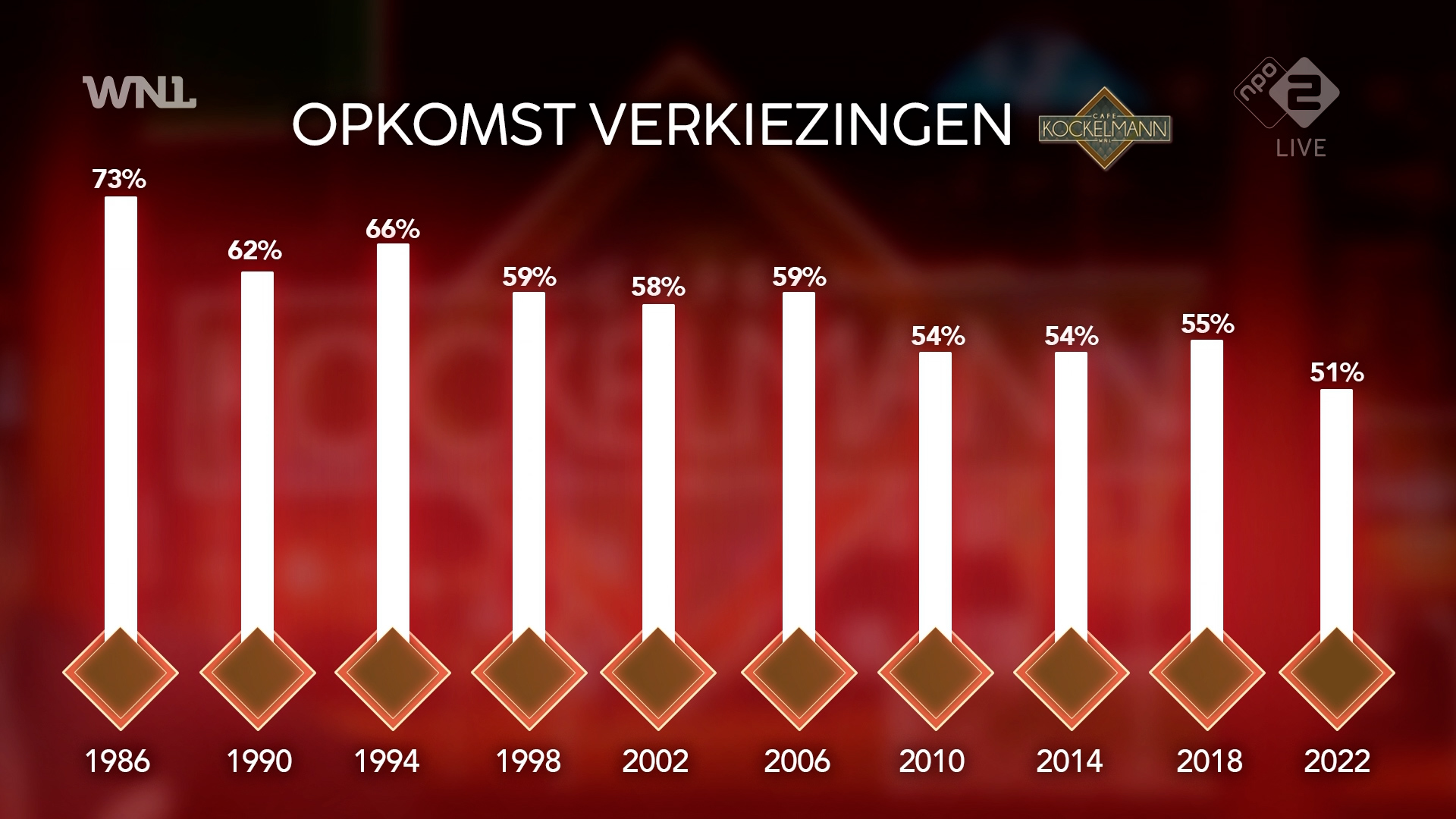 Sinds de jaren 80 is het opkomstcijfer gemiddeld genomen steeds lager geworden. Waar in 1986 nog 73 procent van de Nederlanders naar de stembus ging, was dat bij de laatste gemeenteraadsverkiezingen in 2022 51 procent. "Je ziet het afkalven, dat is treurig", zegt Voermans.