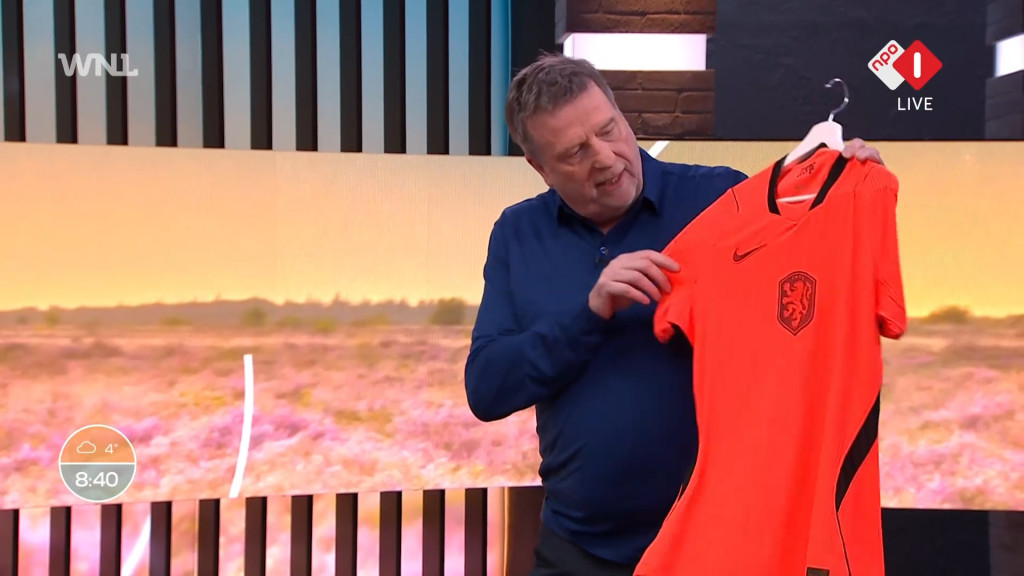 In de studio hangt een rek vol oranje shirts van het Nederlands Elftal, waar presentator Frank van Leeuwen samen met sportjournalist Wessel Penning doorheen gaat. Penning opent scherp: "Nou ja, we kunnen in Nederland best trots zijn op veel dingen, maar niet op onze nationale kleur, denk ik. Ik vind oranje niet een bijzonder mooie kleur. Ik zou mijn kinderen bijvoorbeeld ook niets oranjes aandoen. Maar oké, het is zo."